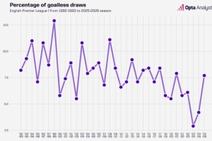体育资讯1月21日讯 据Opta统计,本赛季英超0-0比赛占比近5个赛季最高。