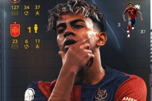 据西班牙媒体《世界体育报》统计,18岁亚马尔达成职业生涯150场比赛里程碑,其中巴萨127场34球37助,西班牙队23场6球11助。