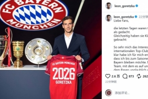 格雷茨卡社媒:我已决定留在拜仁到本赛季结束,然后开启新篇章