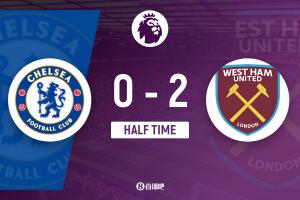 上半场伤停补时5分钟,半场结束,切尔西暂0-2西汉姆联。